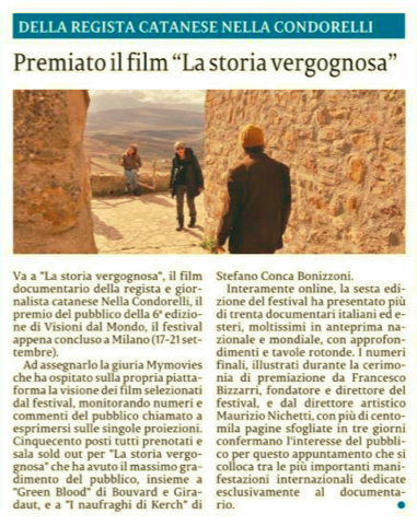Va a La storia vergognosa, il film documentario di Nella Condorelli, prodotto da Factory Film con Istituto Luce – Cinecitta’ in associazione con AAMOD – Fondazione Archivio Audiovisivo del Movimento Operaio e Democratico ed il sostegno della Sicilia Film Commission, il Premio del Pubblico della 6.a edizione di Visioni dal Mondo, il festival internazionale del documentario appena concluso a Milano ( 17-21 settembre). Ad assegnarlo la Giuria Mymovies che ha ospitato sulla propria piattaforma la visione dei film documentari selezionati dal festival, monitorando numeri e commenti del pubblico chiamato ad esprimersi sulle singole proiezioni anche attraverso la votazione in diretta. 500 posti tutti prenotati e sala sold out per La storia vergognosa che ha avuto il massimo gradimento del pubblico, insieme a Green Blood dei francesi Arthur Bouvard e Jules Giradaut, e a I naufraghi di Kerch dell’italiano Stefano Conca Bonizzoni.